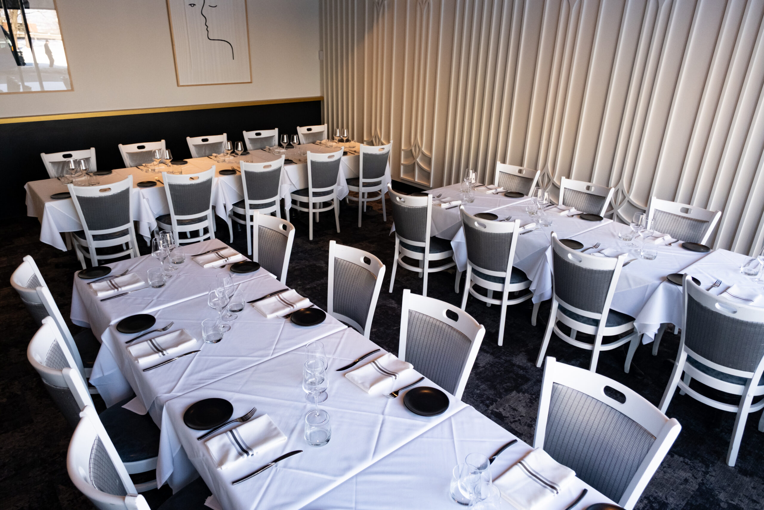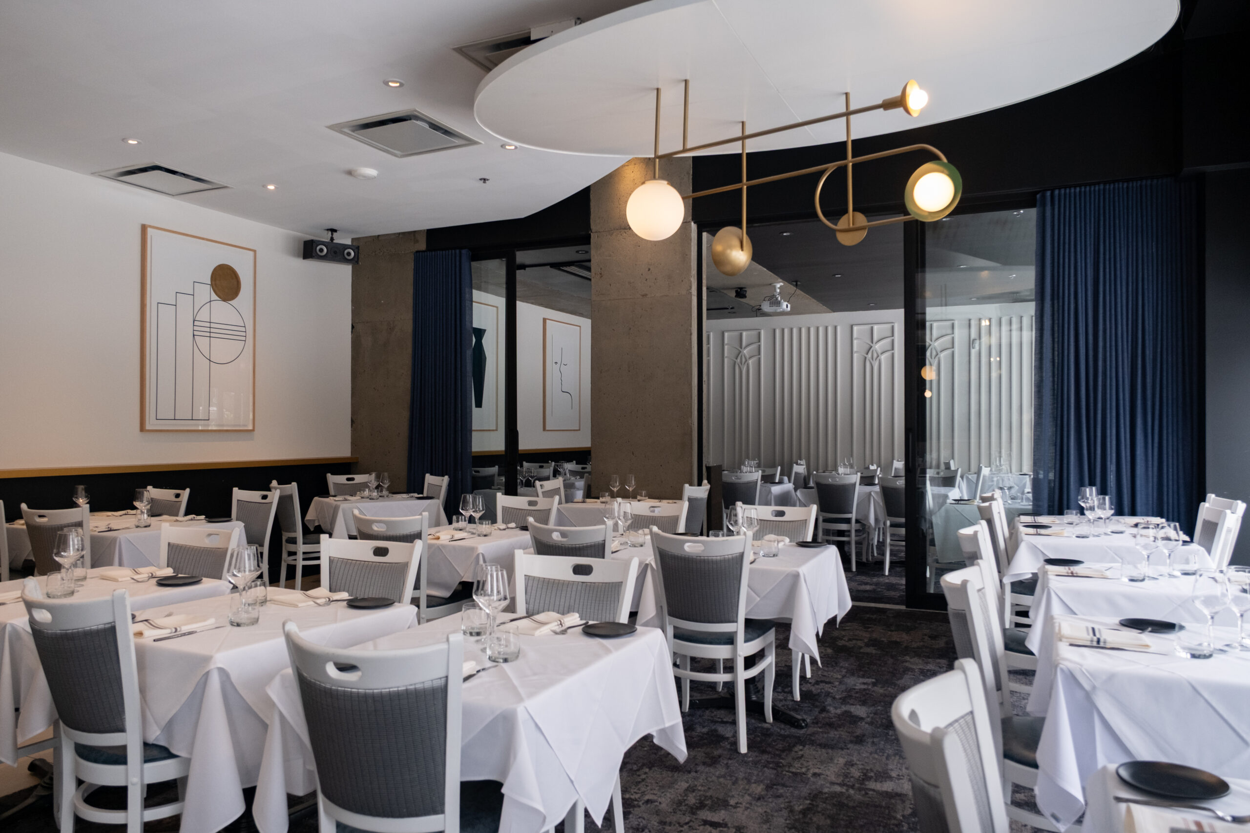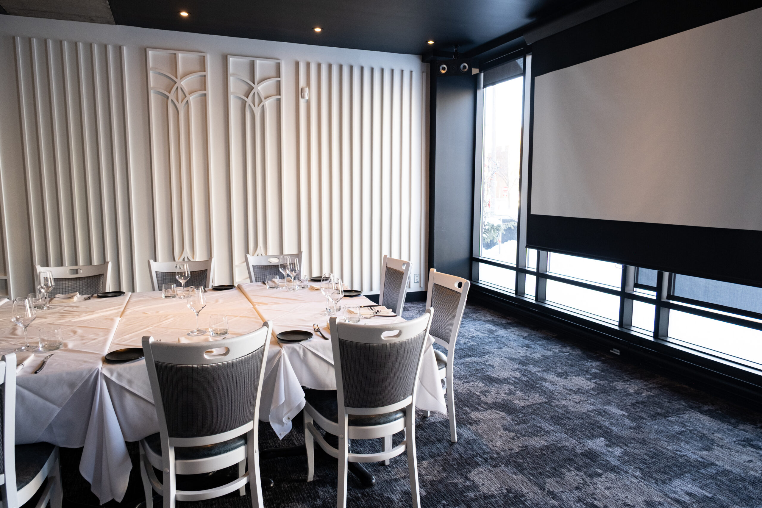 Le salon privé du Quarante 7 se distingue par son équilibre parfait entre modernité et confort. Séparé de la salle principale par de grandes portes vitrées insonorisées, cet espace vous permet de rester visuellement connecté à l'effervescence du restaurant tout en profitant d'un calme absolu. Pour une confidentialité totale, de grands rideaux élégants peuvent être déployés, créant un cocon intime pour vos convives. Que ce soit pour une célébration ou une réunion, l'espace est entièrement équipé d'un système de projection sans fil escamotable, s'intégrant discrètement au décor pour vos présentations ou vos projections de souvenirs.